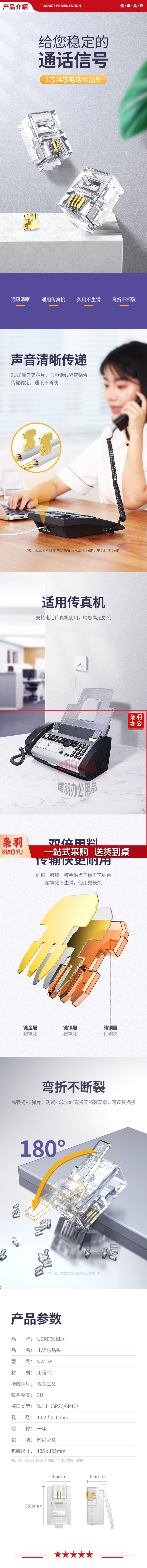 绿联 UGREEN NW138 电话水晶头 80105 6P4C电话线接头 RJ11语音电话线连接器 座机传真机全铜镀金插头 2芯50个装