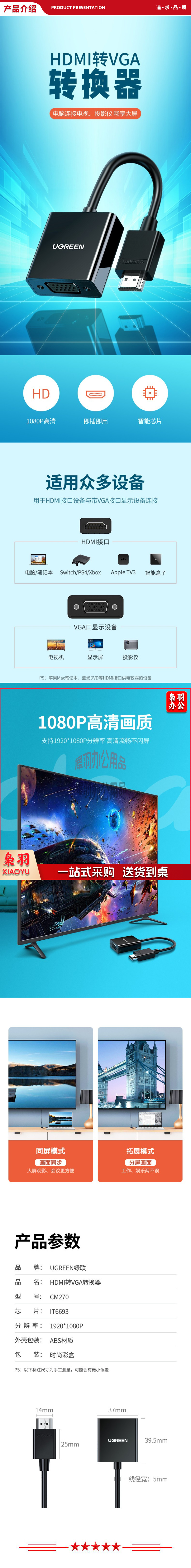 绿联 UGREEN CM270 HDMI转VGA转换器 高清转接适配器 白色-