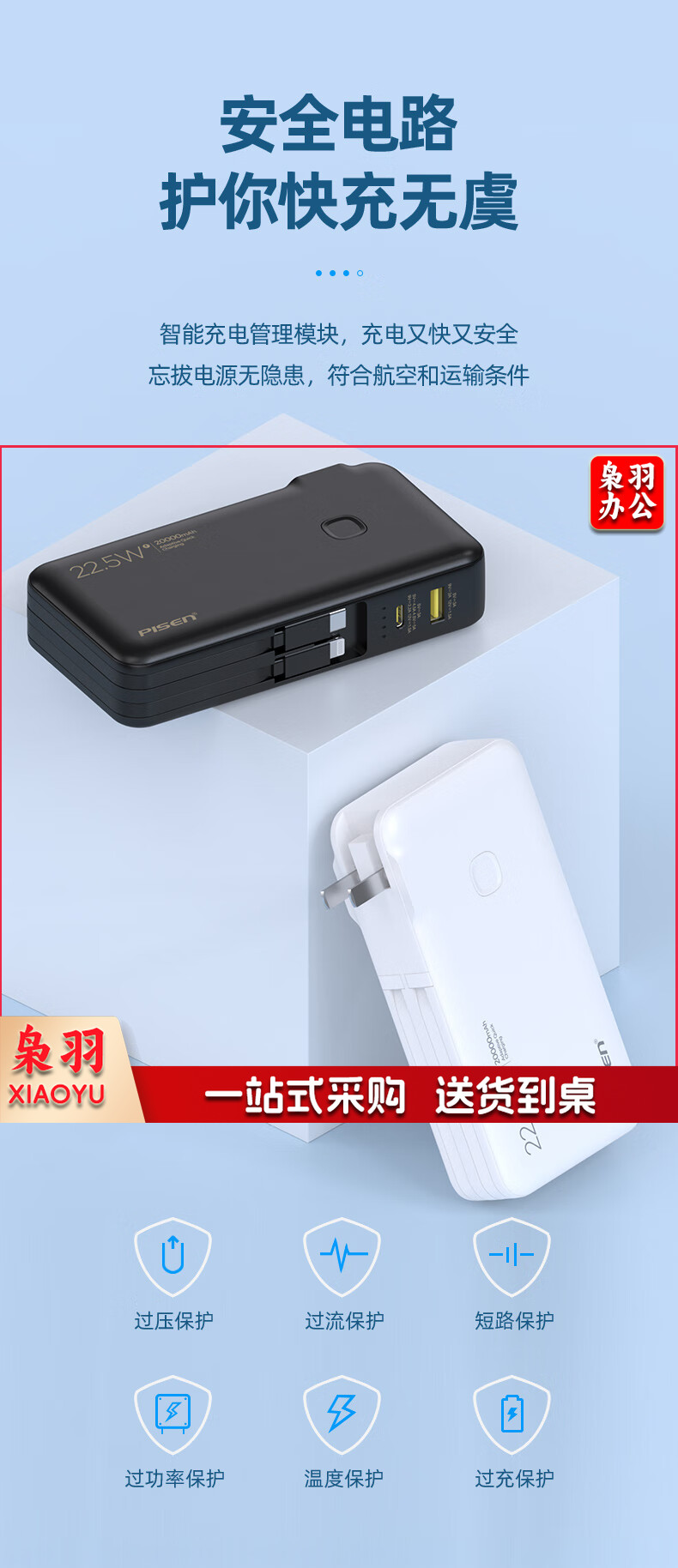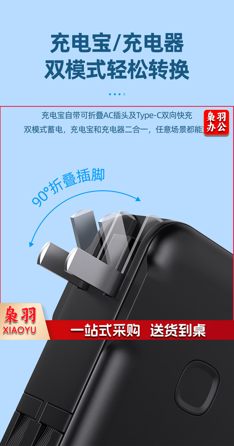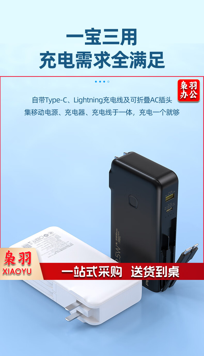 品胜自带双线充电宝20000毫安时大容量22.5W快充插头充电器二合一便携小巧户外移动电源适用苹果14华为小米白