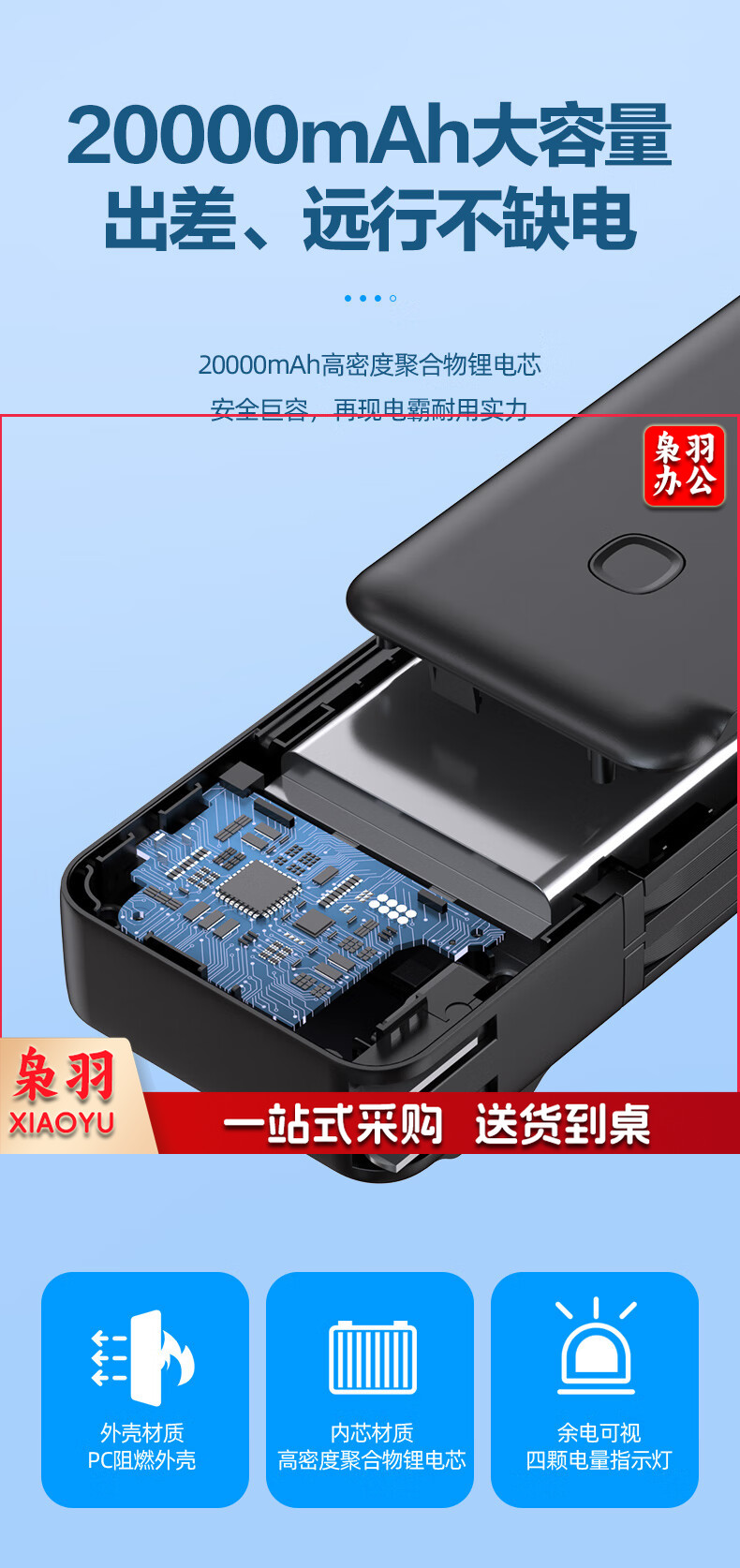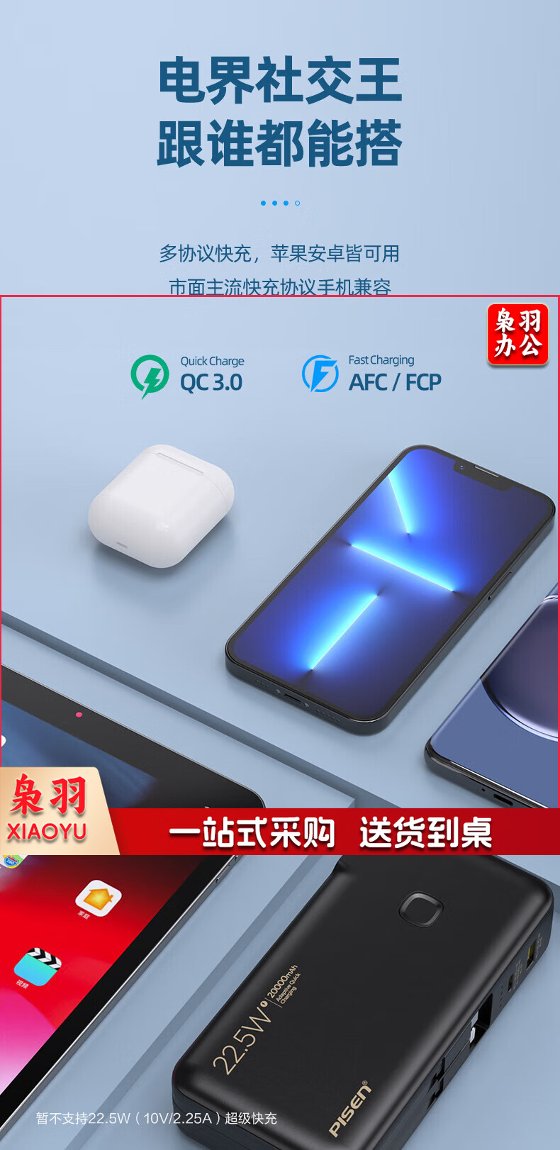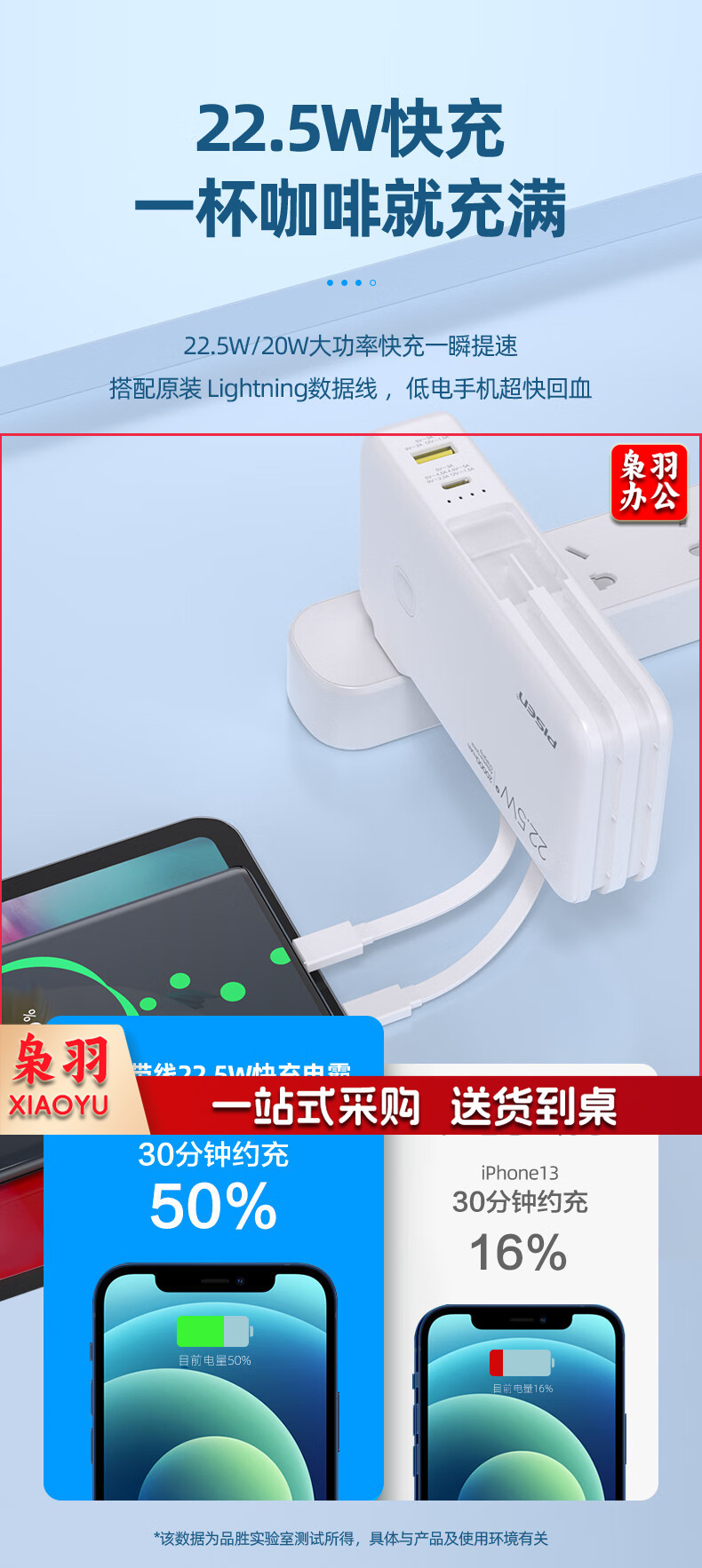 品胜自带双线充电宝20000毫安时大容量22.5W快充插头充电器二合一便携小巧户外移动电源适用苹果14华为小米白
