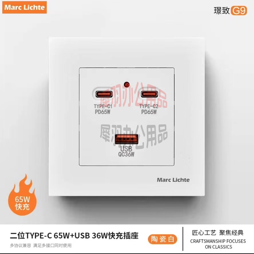 Marc lichte氮化镓3usb-typeC口PD65w超级快充墙壁插座面板 璟致白色单usb+双type-c65w插座