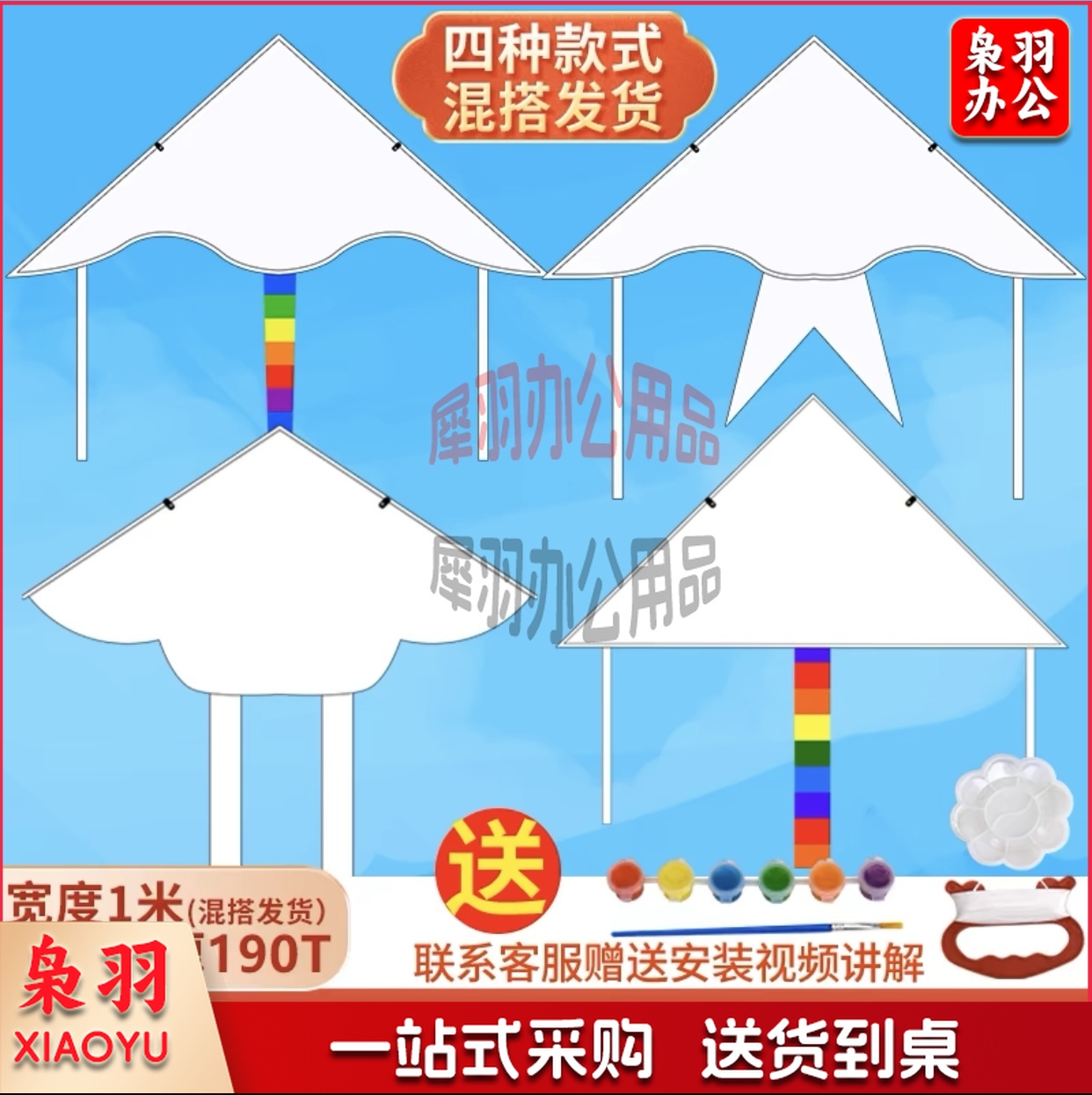 手工风筝 空白风筝涂鸦手绘画风筝 教学diy白色风筝自制材料包(包含1米风筝/ 6色颜料/1只笔/60米线板/调色盘)