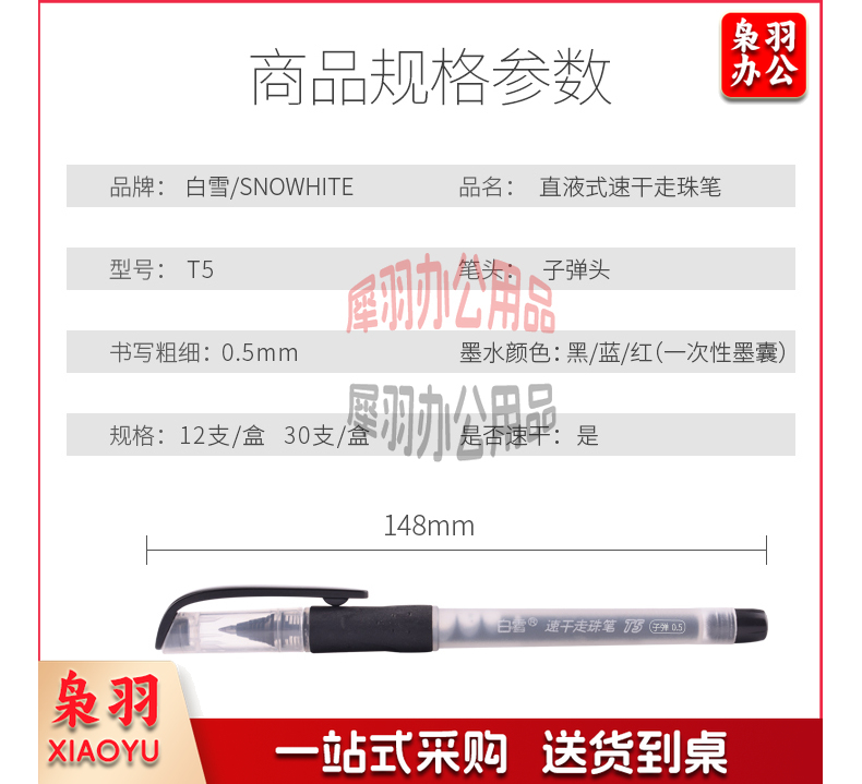 白雪(snowhite)T5速干中性笔学生考试笔商务办公签字笔水笔黑色0.5mm30支/盒