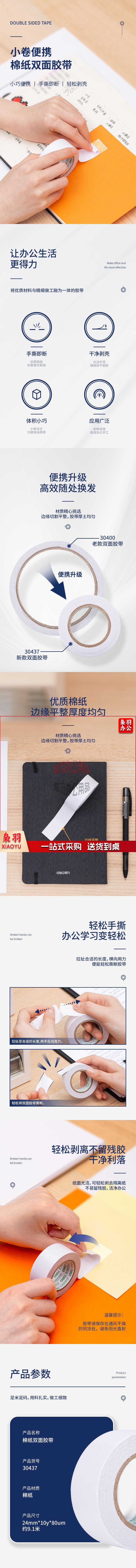 得力30437小卷芯棉纸双面胶带24mm*10y*80um(白色)(1卷/袋)