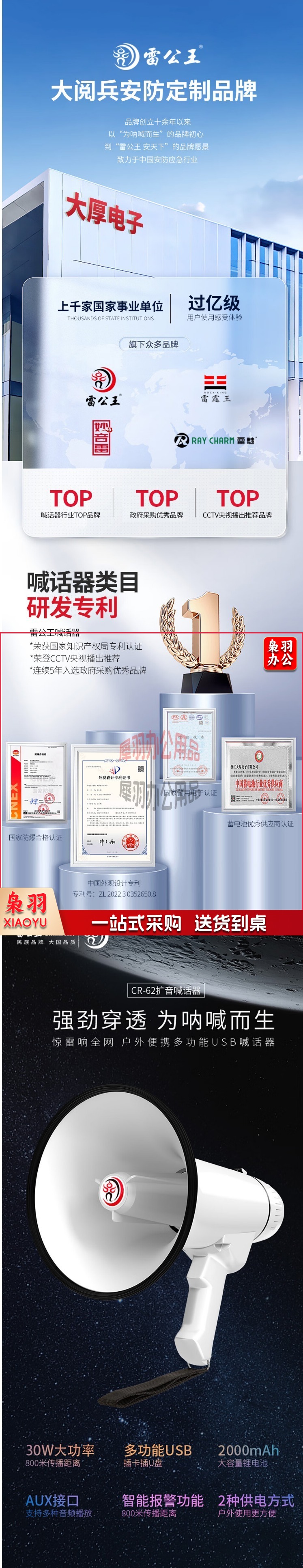 雷公王喊话器 CR-62喊话器大功率30W户外手持喊话器 usb扩音器录音喊话器扩音喇叭扬声器大声公便携式高音喊话器喊话器 黑色 蓝牙/USB款 2000毫安锂电池