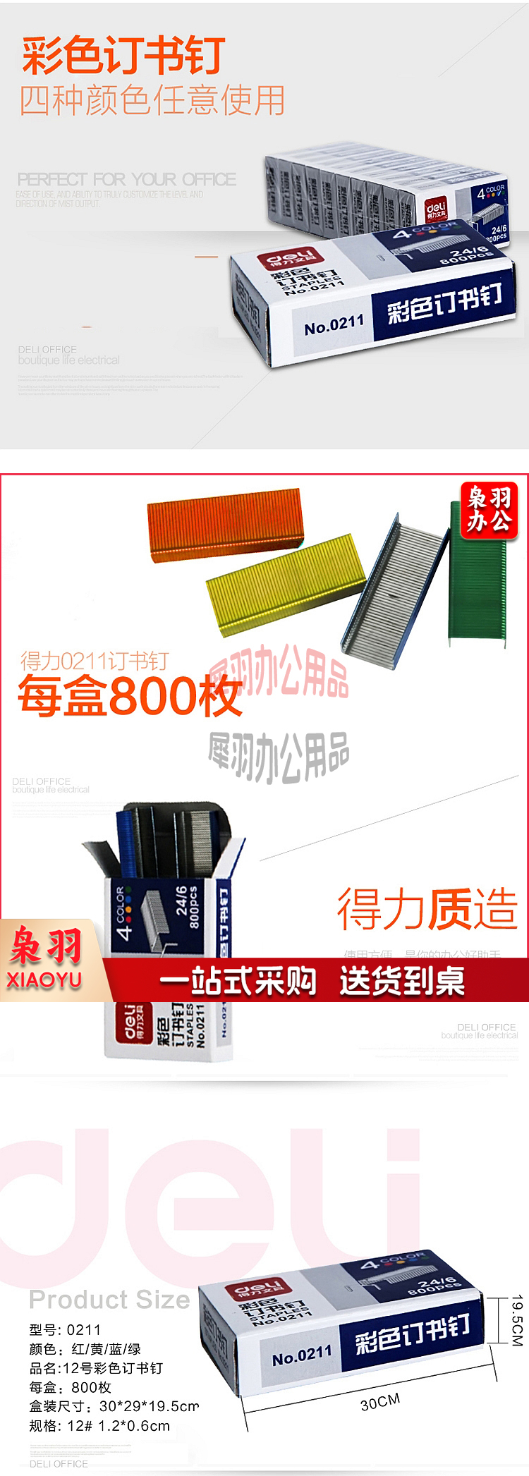 得力0211彩色订书钉12# 24/6 800枚/盒 (单位:盒) 混色