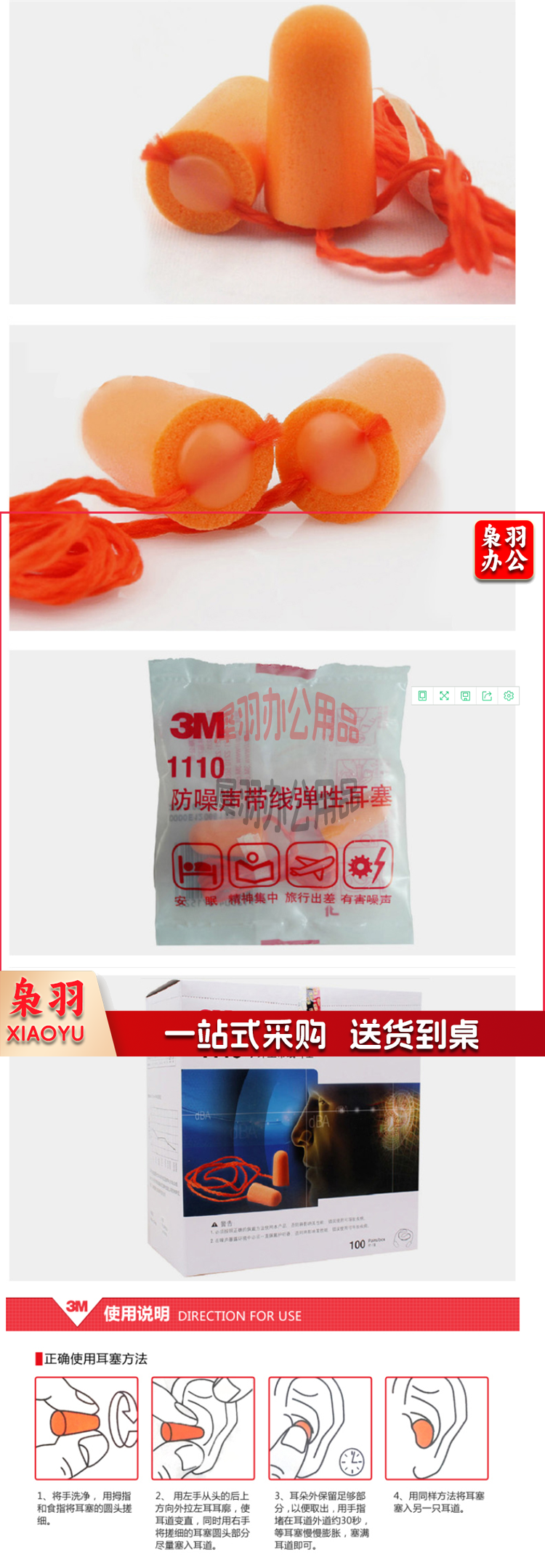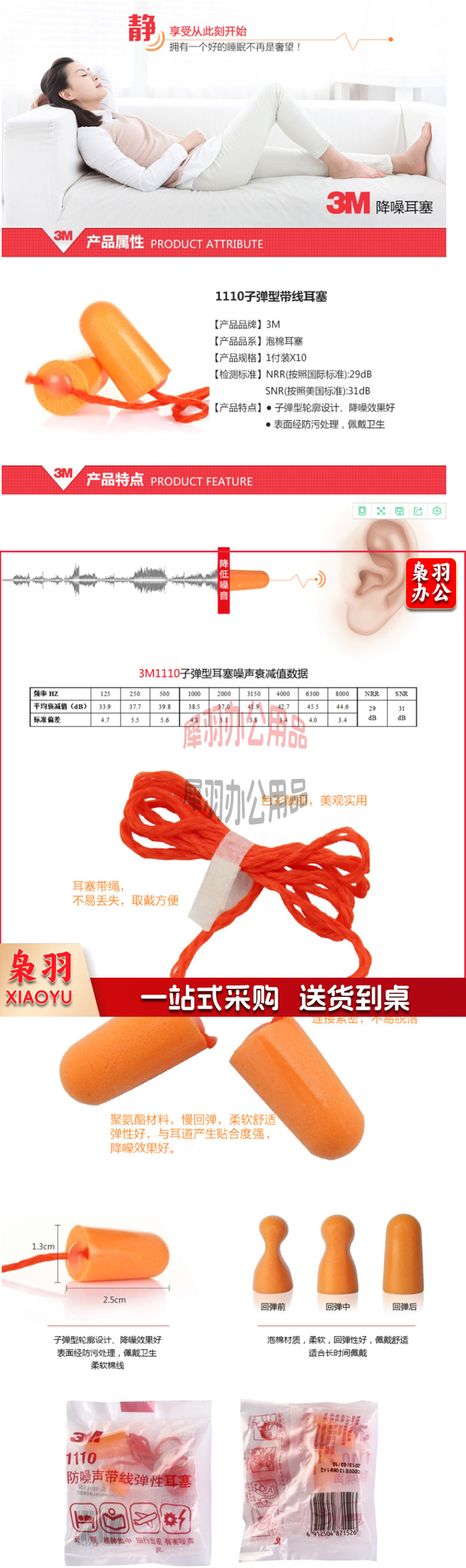 3M 1110(带线) 耳塞抗噪 防噪音 睡眠隔音耳塞(100付/盒)