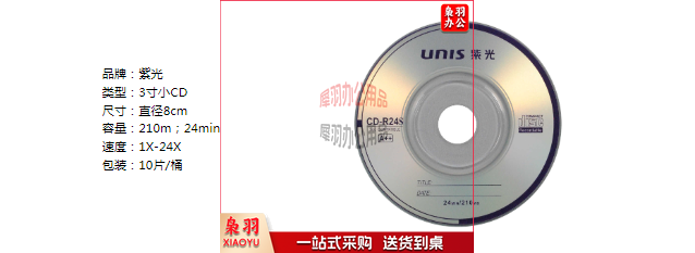紫光(UNIS)CDR光盘 钻石系列 8CM(3寸)小盘 24速 刻录盘 空白光盘 碟片210M 桶装10片 A+
