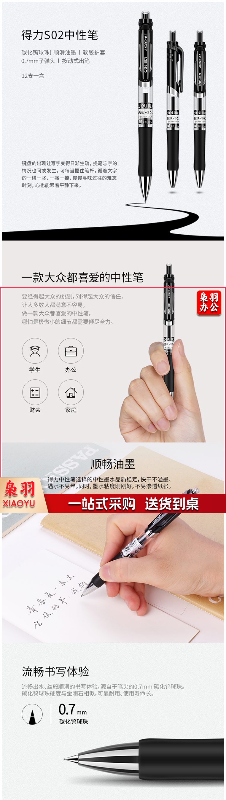 得力(deli) S02 0.7mm按动中性笔水笔签字笔 黑色 12支/盒