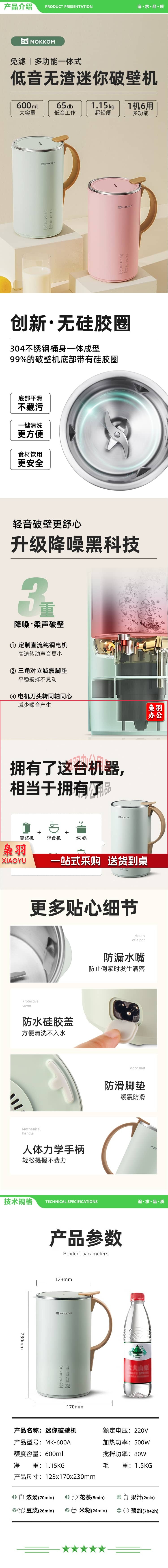 磨客 mokkom MK-600A 破壁机迷你豆浆机小型免过滤免煮预约多功能家用自动辅食机1-3人榨汁搅拌一机六用 绿色