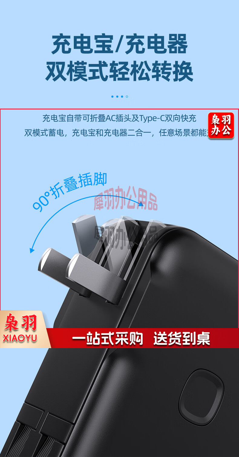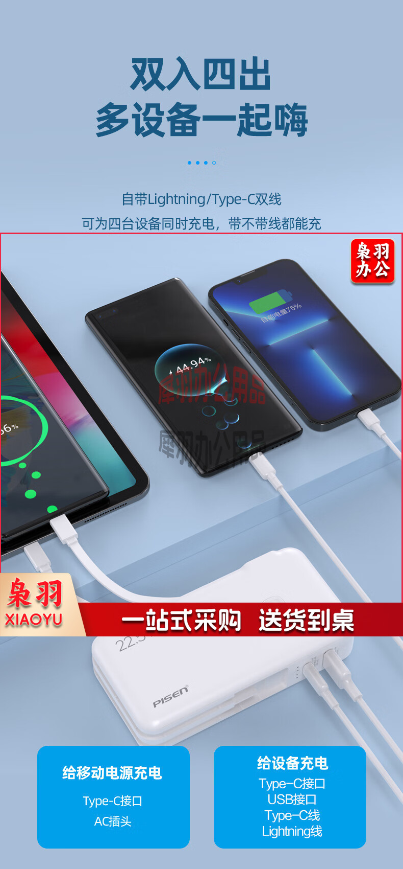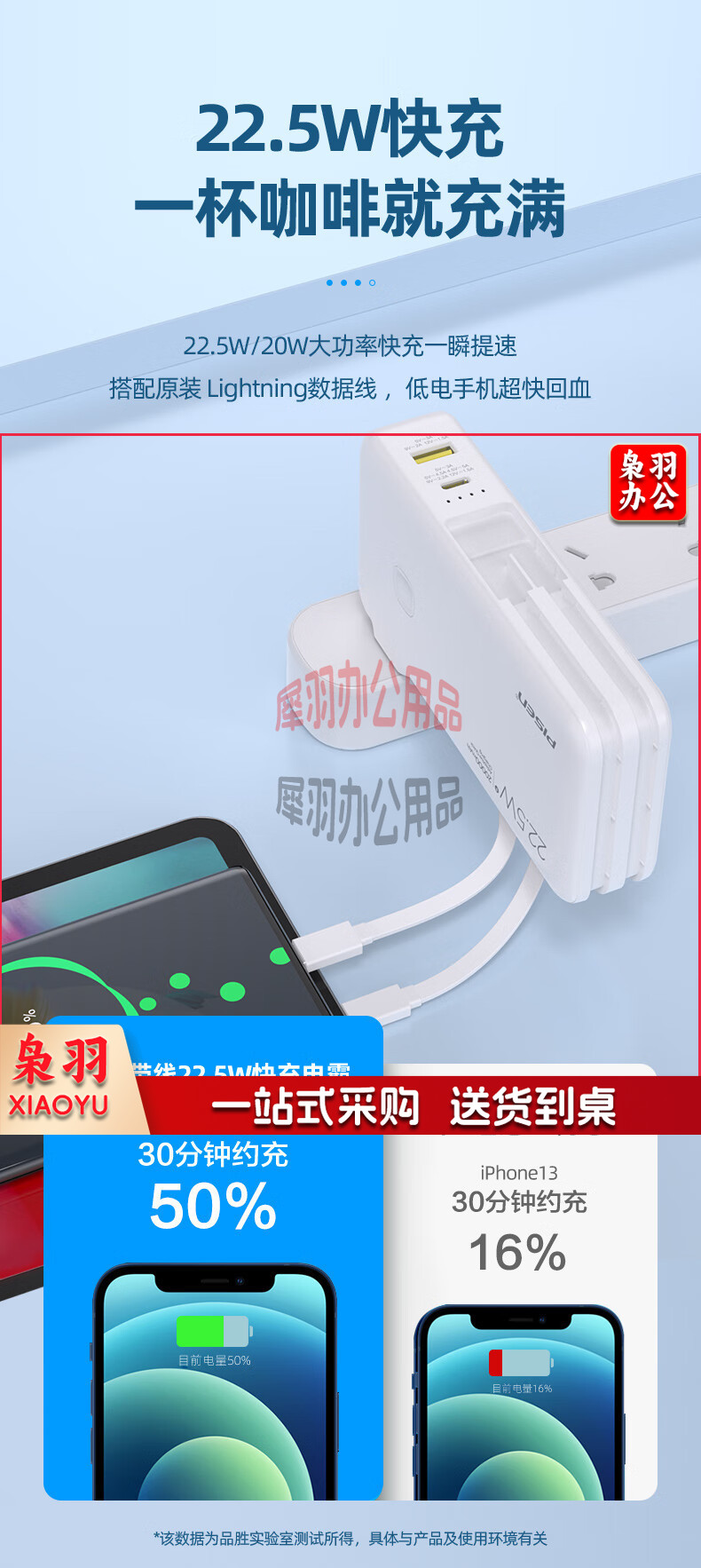 品胜自带双线充电宝20000毫安时大容量22.5W快充插头充电器二合一便携小巧户外移动电源适用苹果14华为小米白