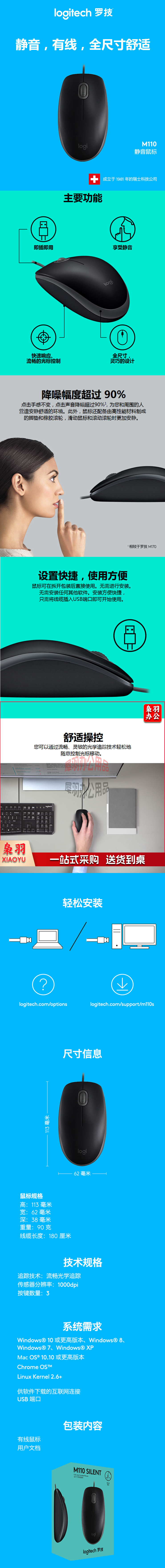 罗技( Logitech) M110 有线静音鼠标 黑色