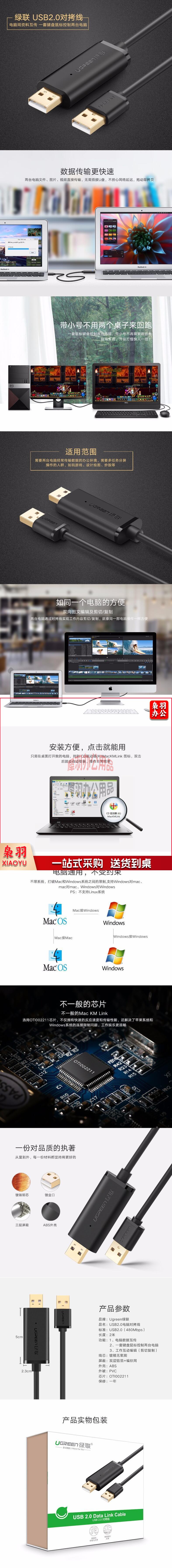 绿联 USB2.0 对拷线公对公 镀金接口 2米 20233 黑色