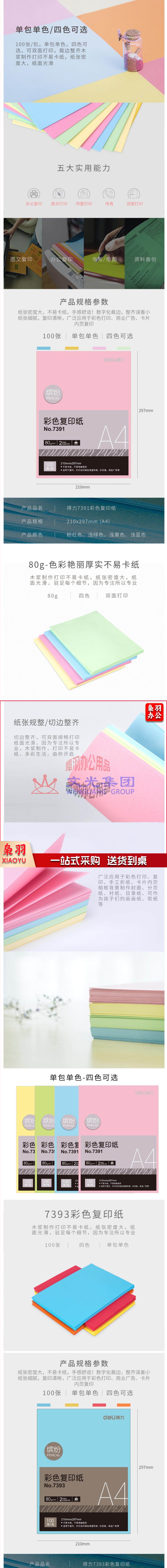 A4彩纸粉纸 10色混装/100张 得力80g彩纸彩色a4彩纸 打印彩纸