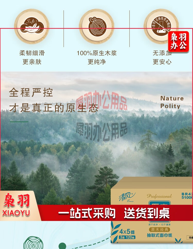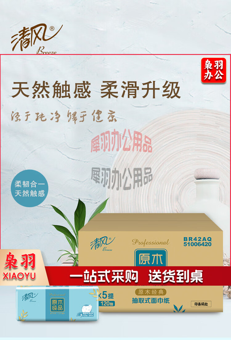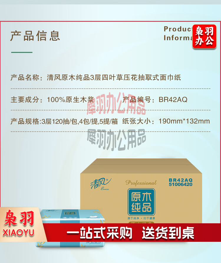 清风 原木纯品3层四叶草压花120抽抽取式面巾纸 4包每提 BR42AQ