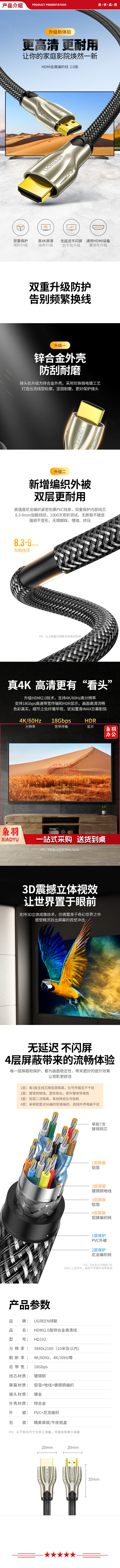 绿联 UGREEN 11195 HDMI高清线2.0版 HD102 3D信号音视频线 4K数字高清线 圆线 10米 bwsj-2022080724028