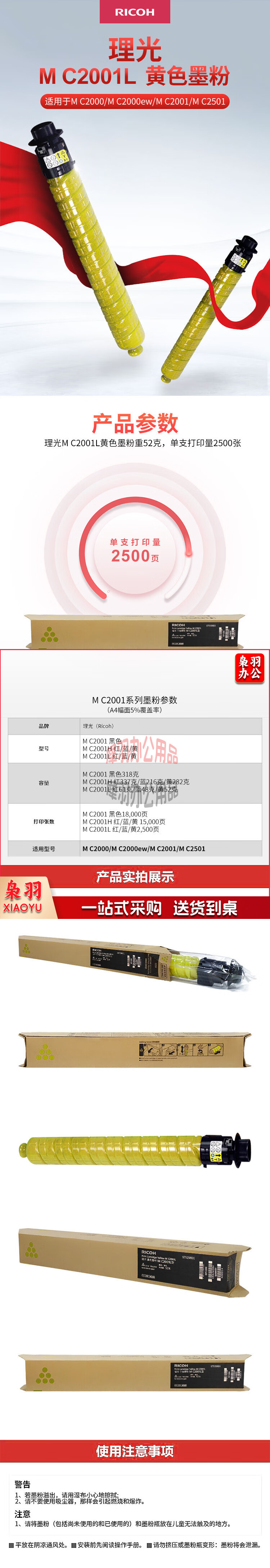 理光(Ricoh)M C2001L 黄色墨粉盒 适用于M C2000/M C2001/M C2000ew/M C2501