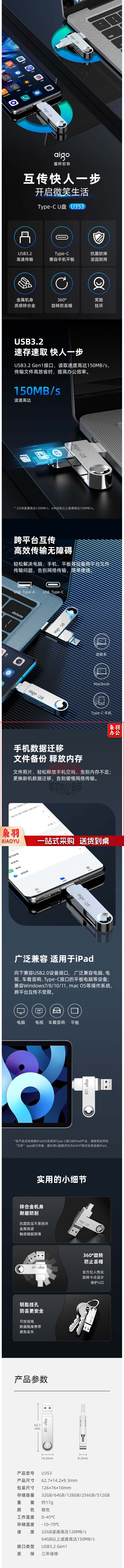 爱国者(aigo)128GB Type-C USB3.2 双接口手机U盘 U353 速存读取 多平台兼容 hysm-241127140717