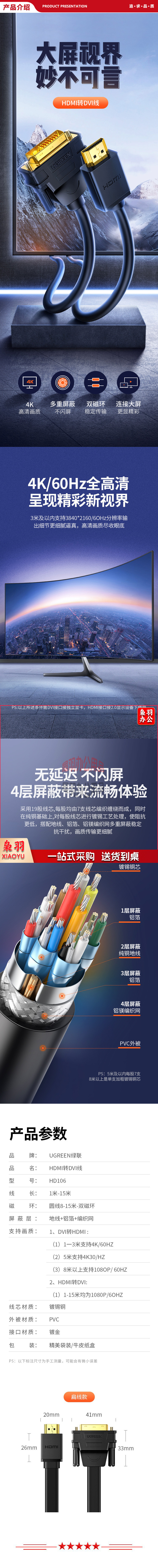 绿联11150 UGREEN HDMI转DVI转换线 HD106 4K 双向互转视频连接线 1.5米
