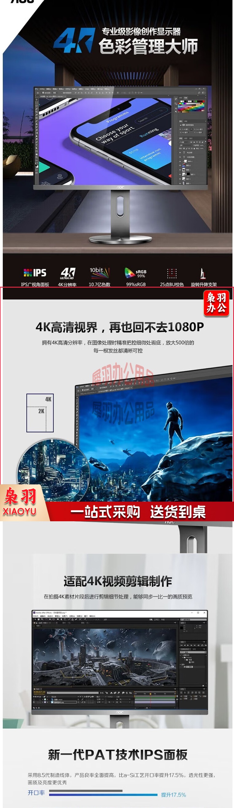 冠捷/AOC 27英寸液晶显示器 2K IPS广视角 106%NTSC广色域 商用办公 节能 低蓝光不闪 旋转升降液晶显示器 U2790PQ