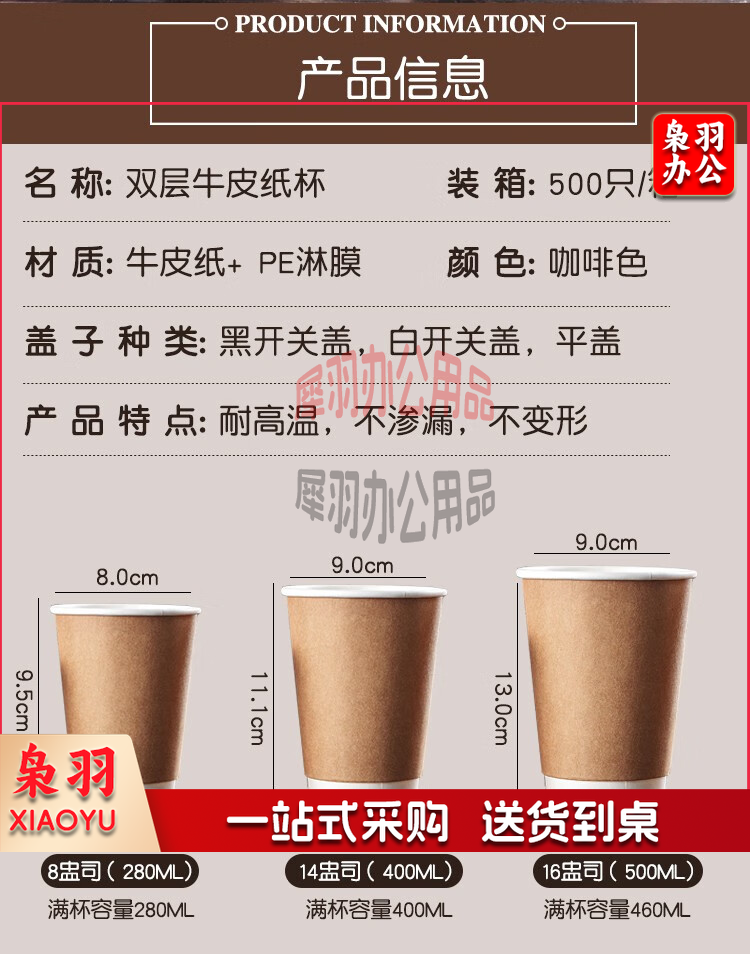 一次性 加厚双层牛皮纸杯 500ml 不带盖
