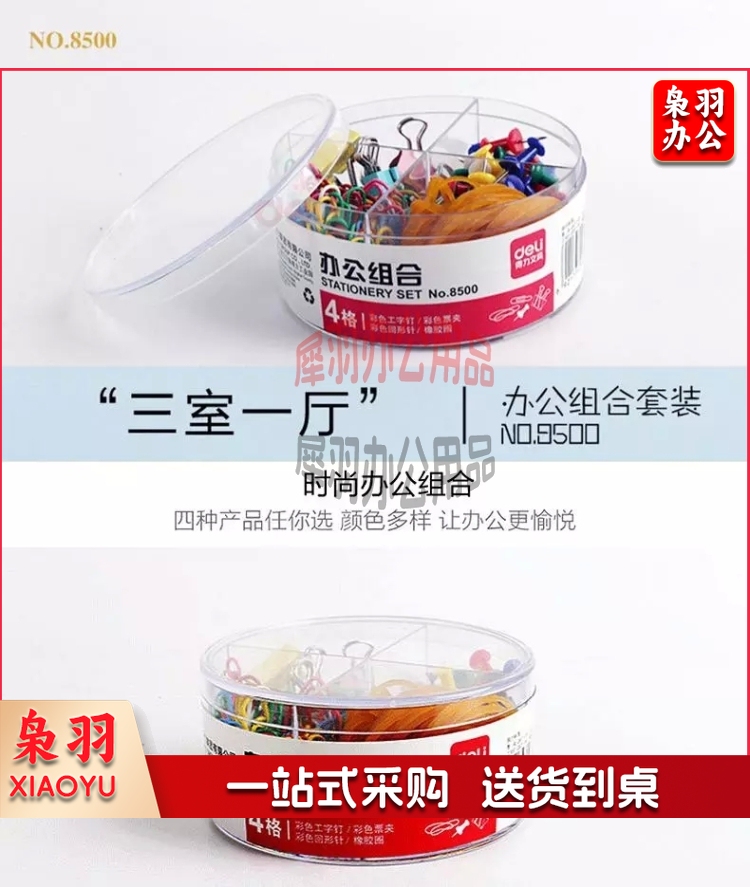 得力(deli)8500四合一办公用品组合套装 (19mm小号票夹10只+29mm回形针100只+工字钉50只+橡皮筋)/盒