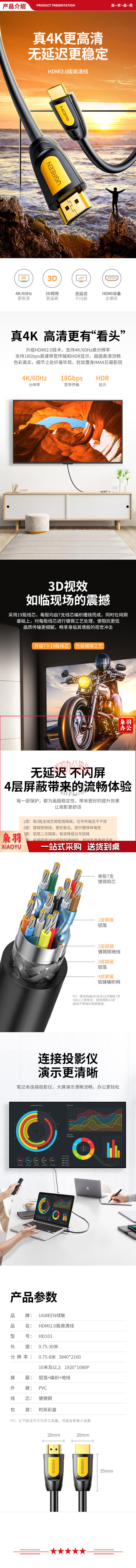 绿联 UGREEN 10151 HDMI线 HD101 工程级4K数字高清线 3D视频线 黄黑头 0.75米