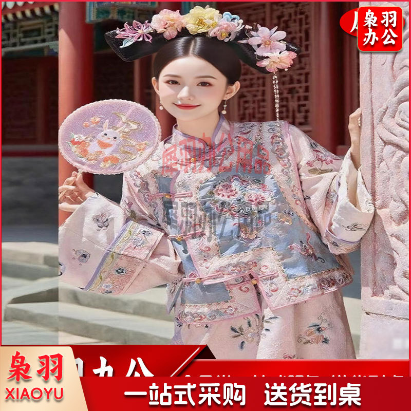 成人汉服清代印花古装清朝格格马甲旗装两件套旅拍(均码不带头饰)