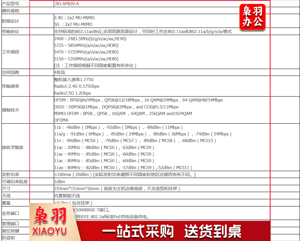 锐捷(Ruijie)RG-AP820-A 双路双频802.11ax无线接入点 白色 -