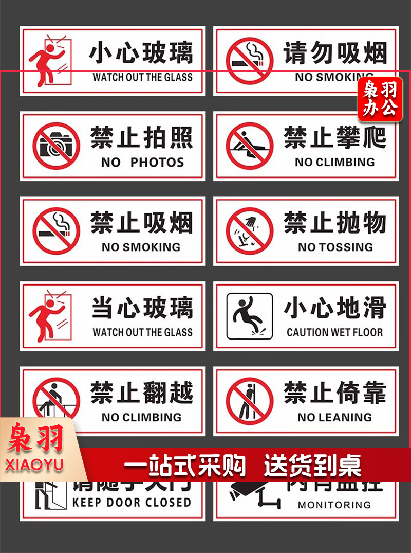 当心玻璃【25x10cm】小心玻璃提示禁止吸烟透明贴纸小心地滑禁止倚靠禁止翻越商场提示