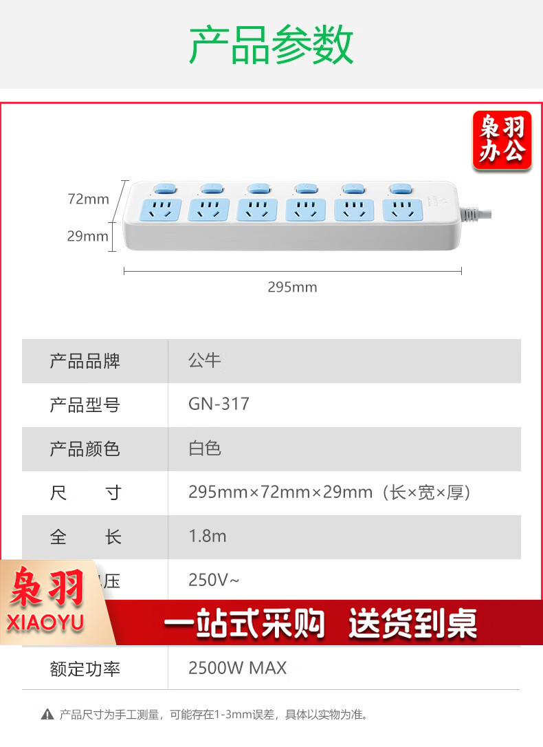 公牛 GN-317插座1.8米/排插/接线板/插线板独立开关/6孔分控 单位:个