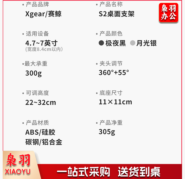 赛鲸/XGear S2升降款 手机支架 0-50cm 黑色(单位:个)