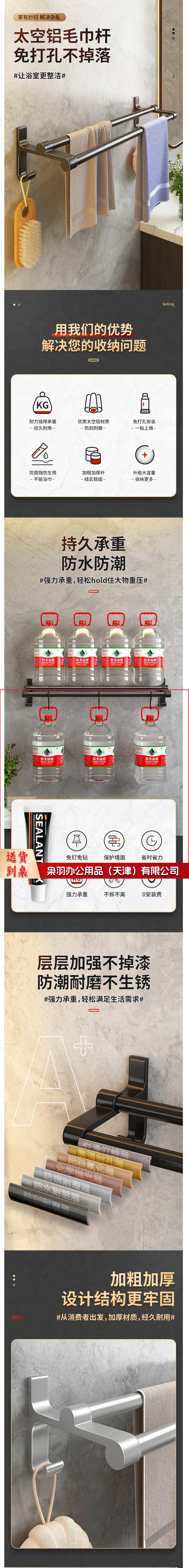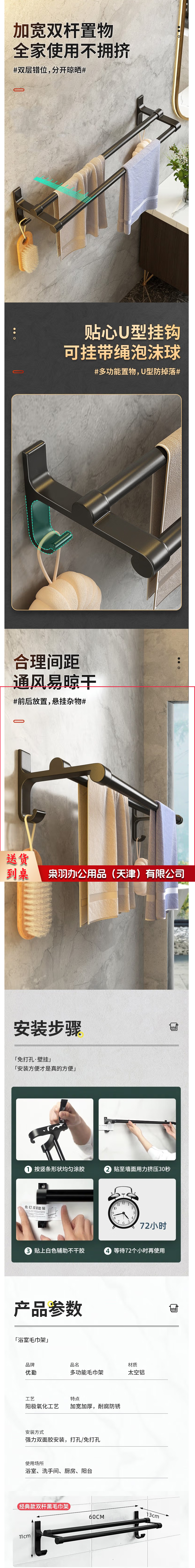 卫生间毛巾架免打孔浴室墙上双杆挂架浴巾收纳挂钩壁挂置物架 双杆黑-60cm