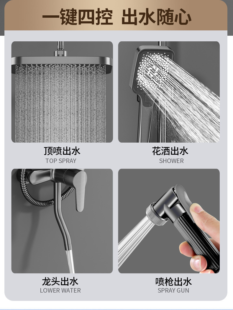 学校淋浴花洒套装淋浴器卫生间精铜枪灰恒温洗澡淋雨浴霸增压花洒(钢琴数显按键【雅黑色】四档冷热出水●送置物架)