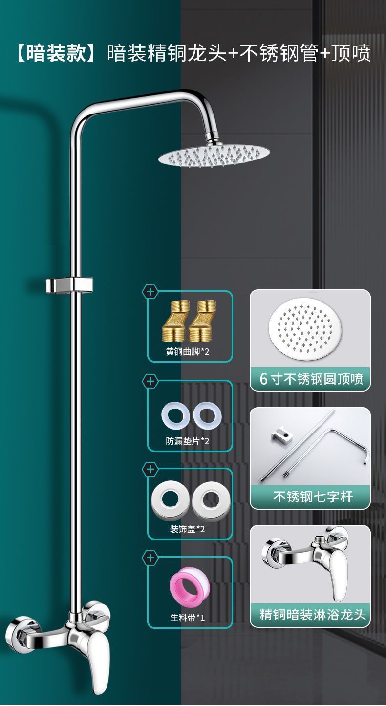 花洒淋浴配件套装公共澡堂淋浴室(【暗装单水】铜龙头+不锈钢直管+不锈钢喷头)洗浴池宾馆学校工地简易单水明装暗装冷热花洒套装