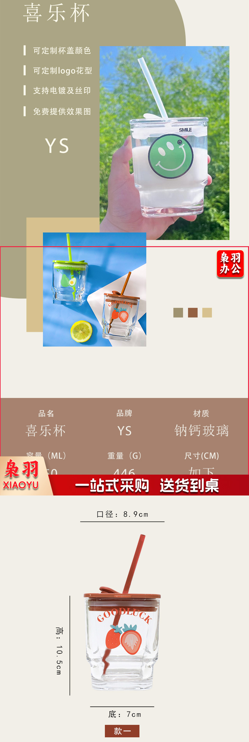 玻璃杯喜乐杯大容量新款家用网红带盖吸管杯 咖啡杯水杯子(2个起 量大可定logo))
