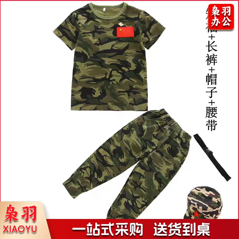 儿童迷彩服套装短袖T恤小学生幼儿园演出服研学夏令营服装军训服套装+帽子+腰带
