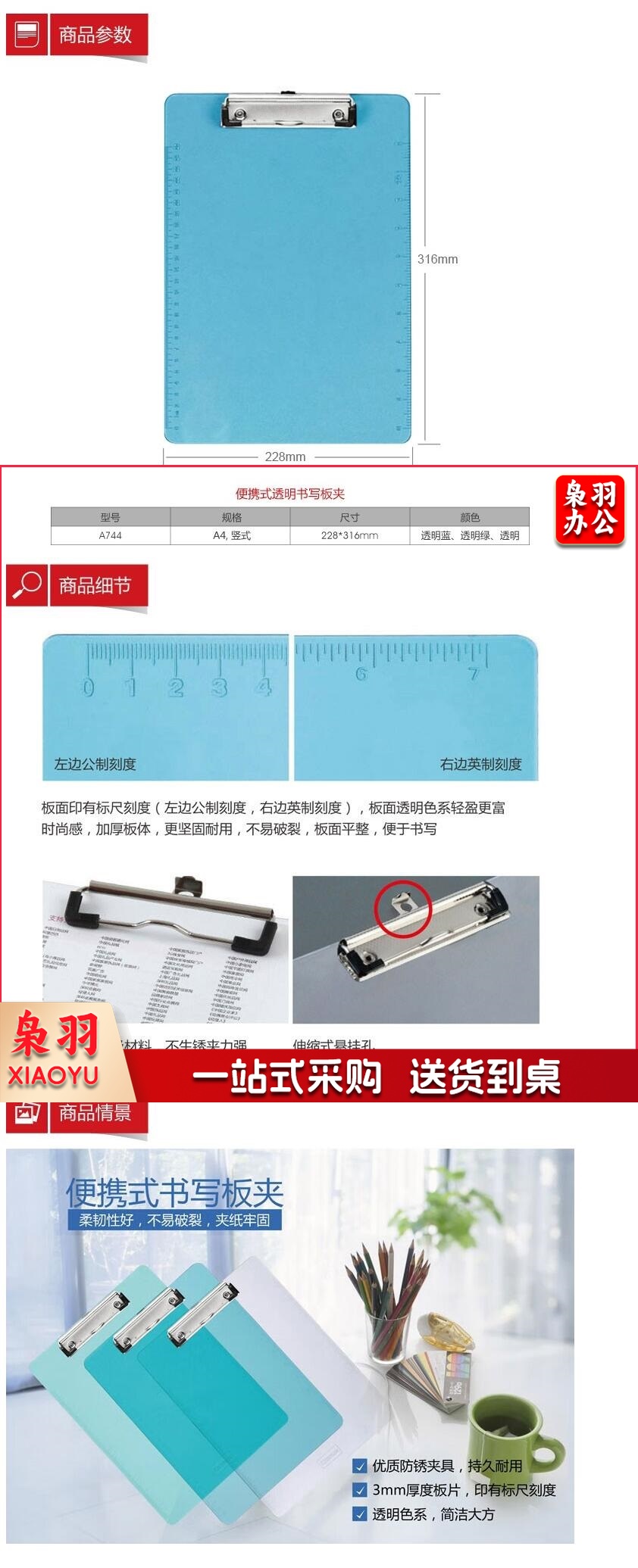 齐心书写板夹 A744 塑料板夹 货号:WY