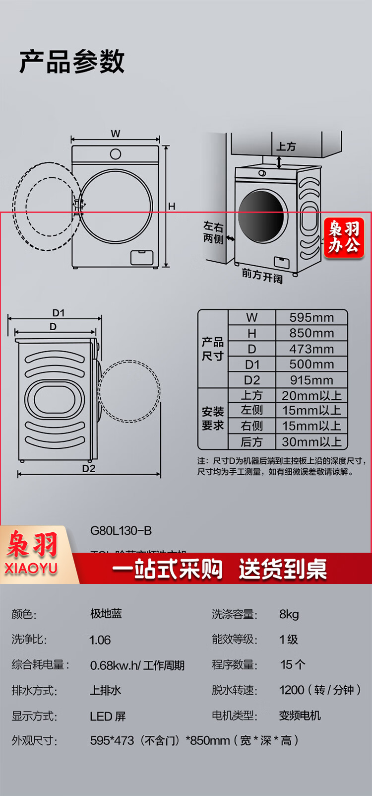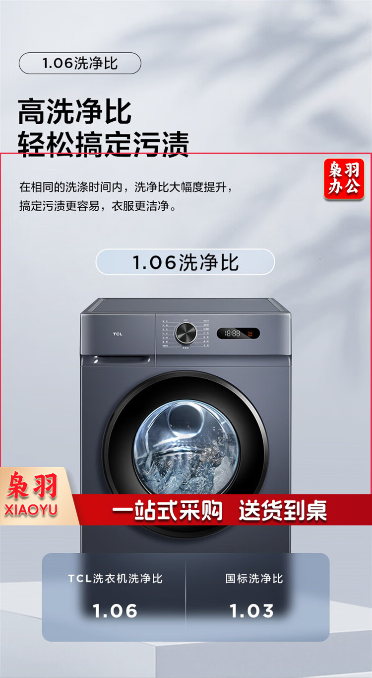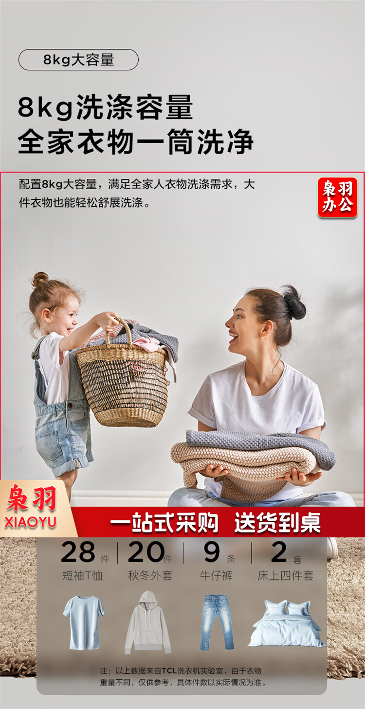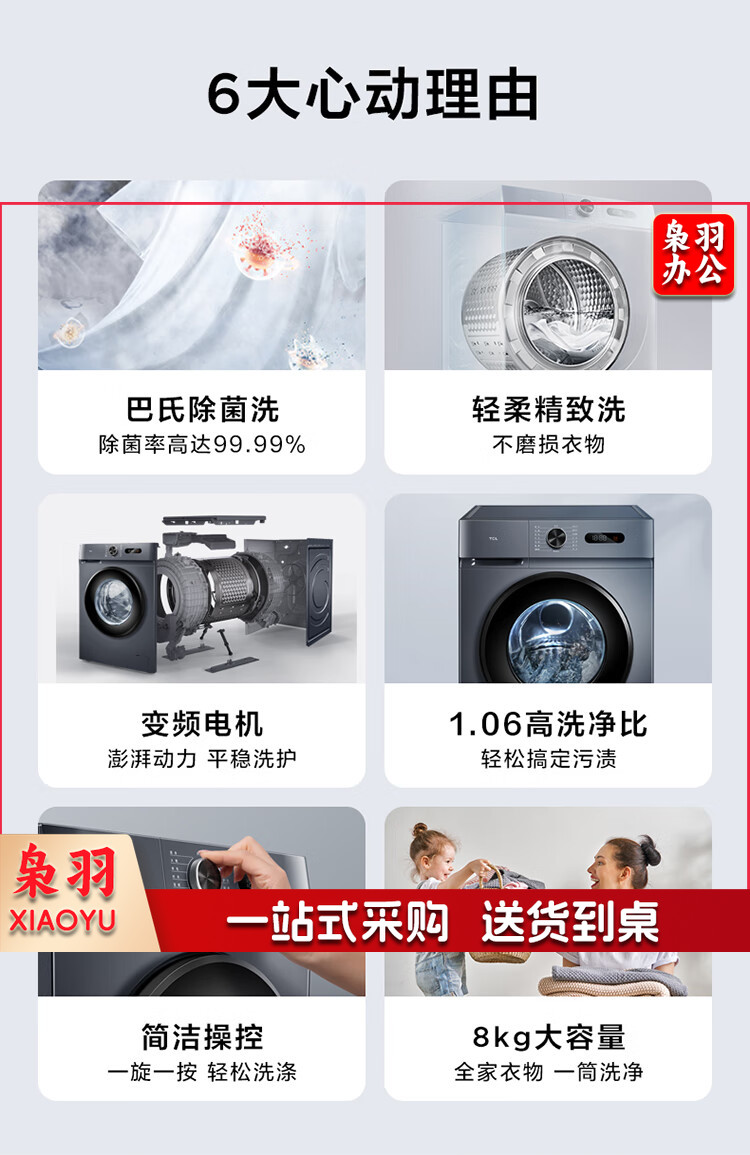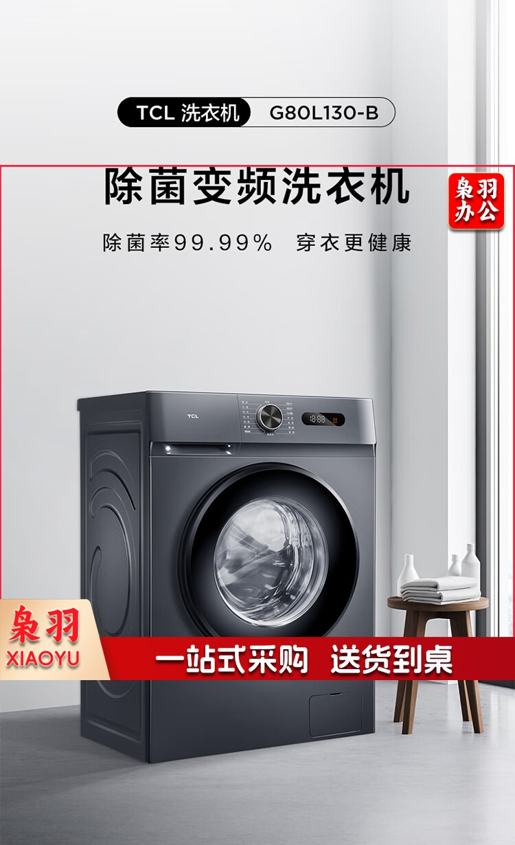 TCL 8KG除菌变频洗衣机 L130 巴氏除菌 一级能效 中途添衣 除菌率≈100% G80L130-B