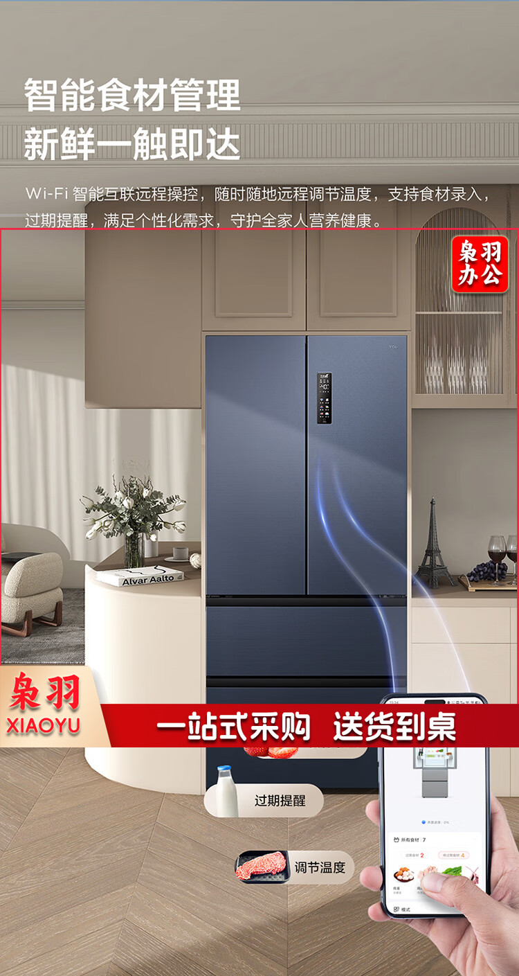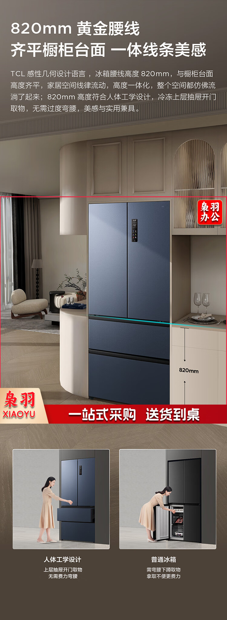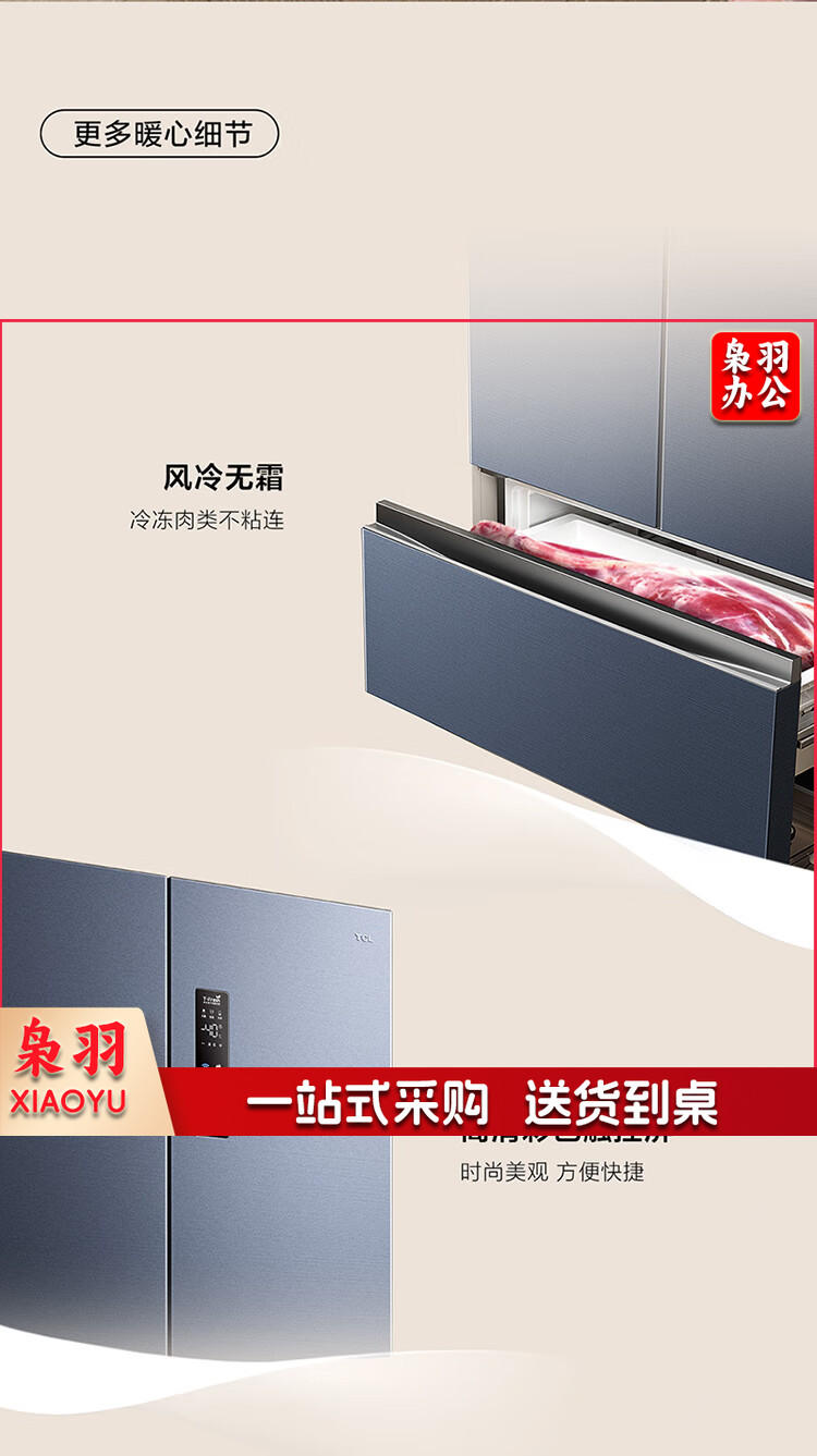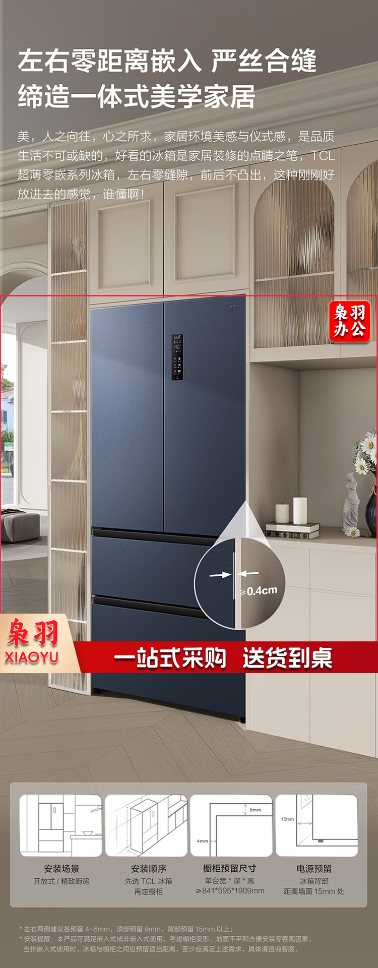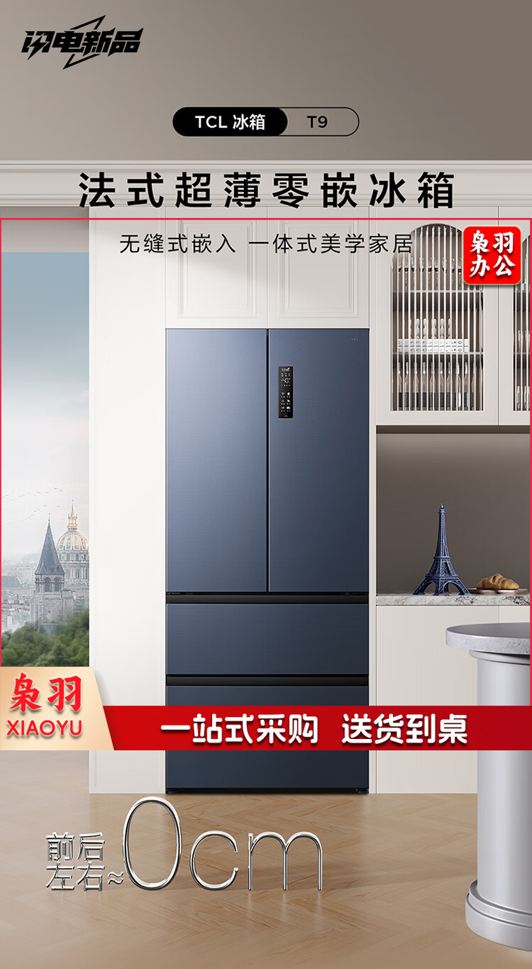 TCL 468升T9法式四门58cm超薄嵌入式冰箱杀菌除味双循环一级能效风冷无霜家用电冰箱R468T9-DQ