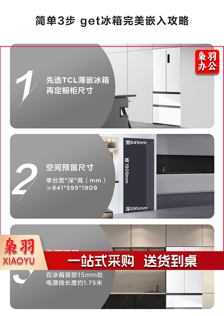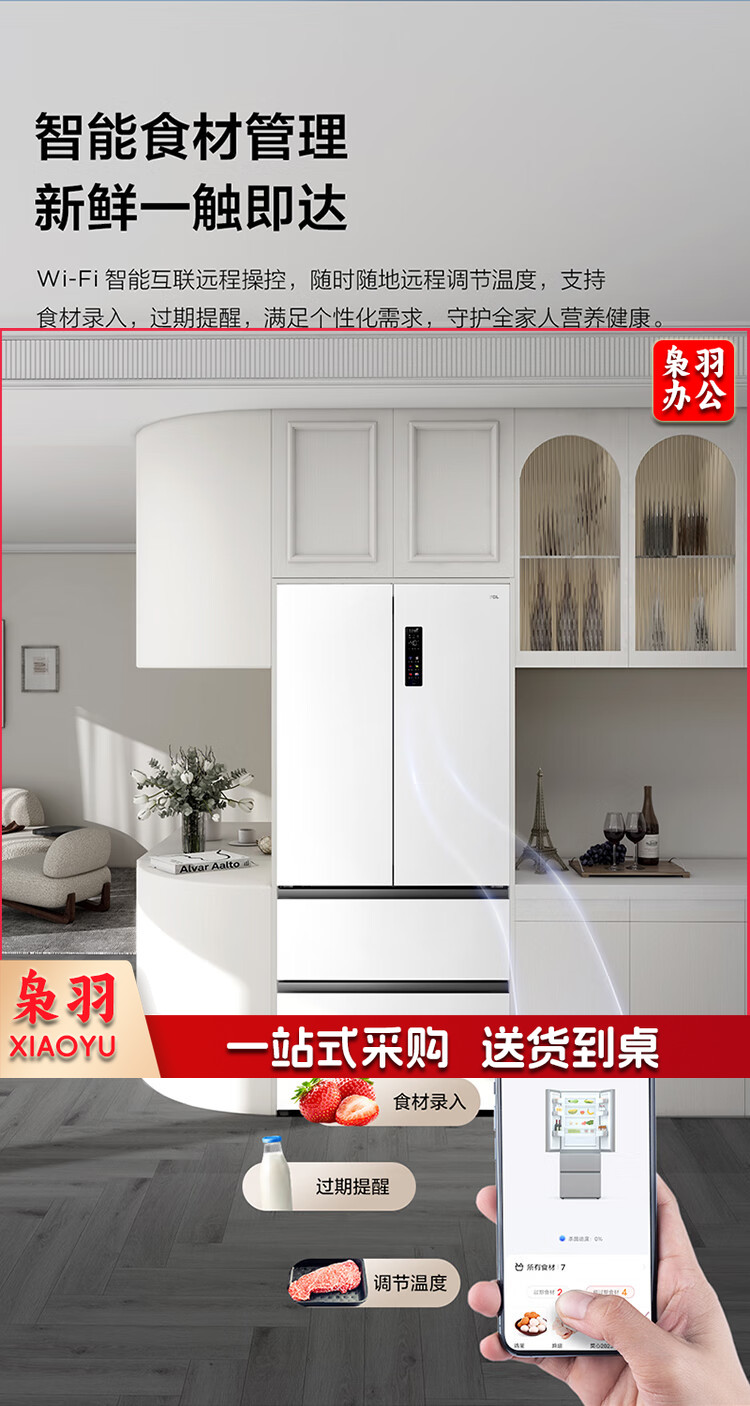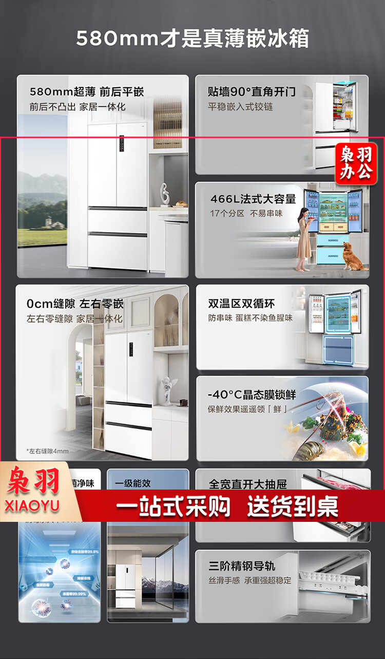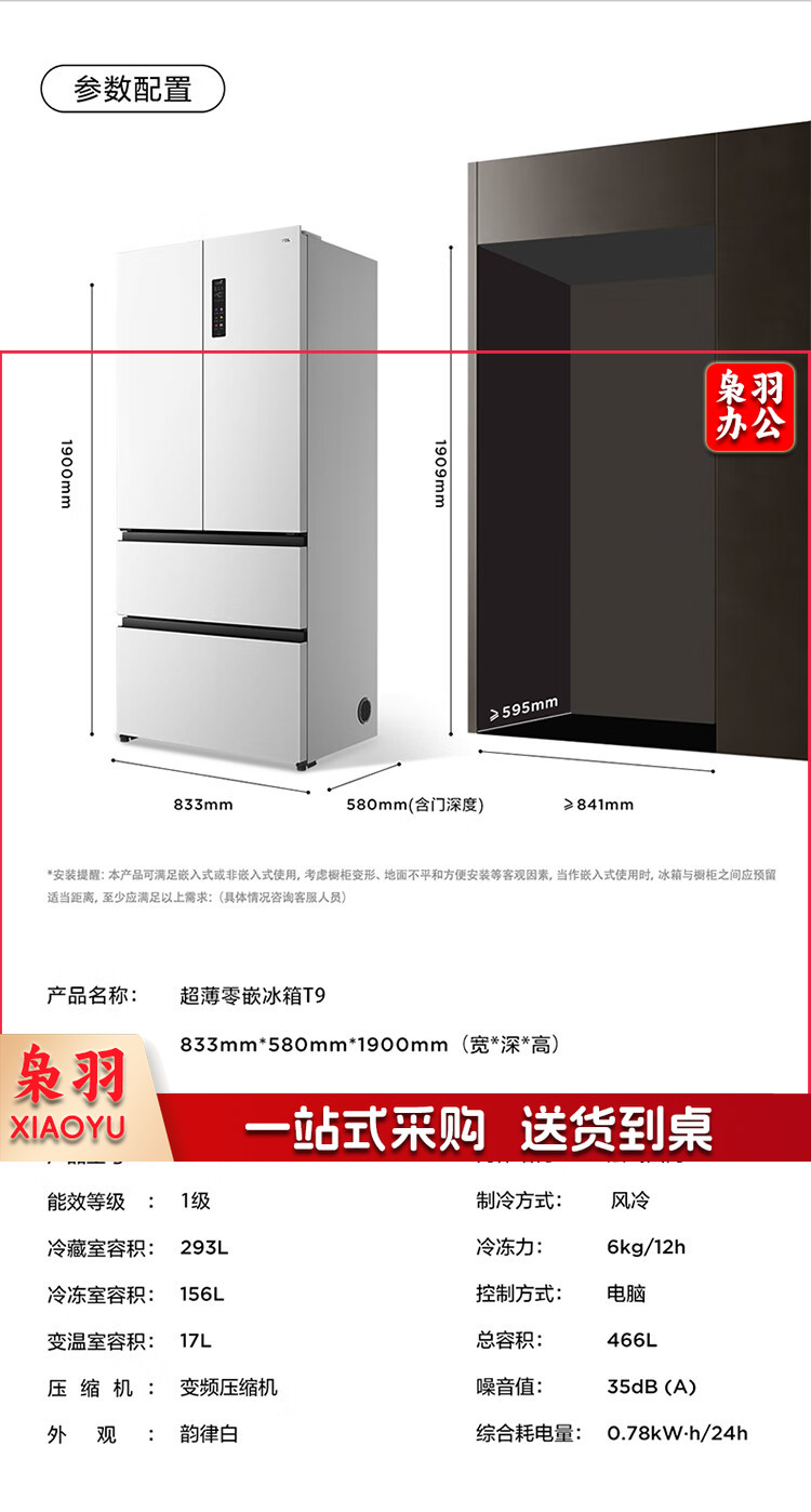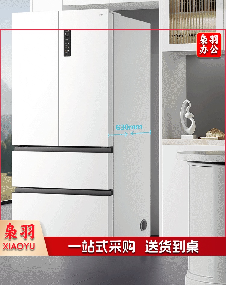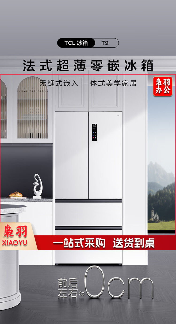 TCL 466升T9法式四开门58cm超薄零嵌入式白色风冷家用电冰箱杀菌除味一级能效大容量双循环R466T9-DQ