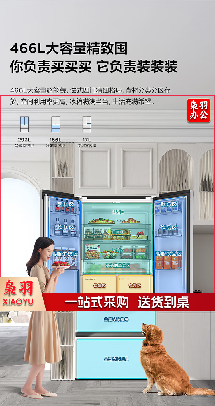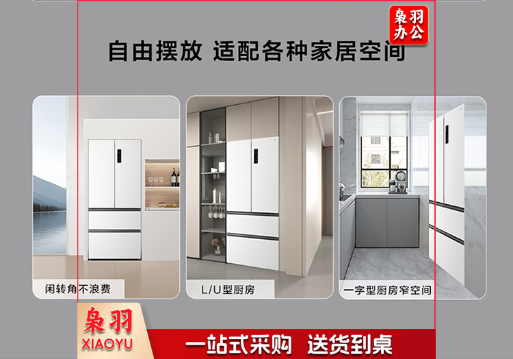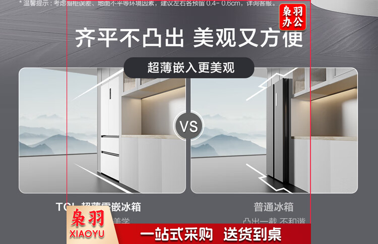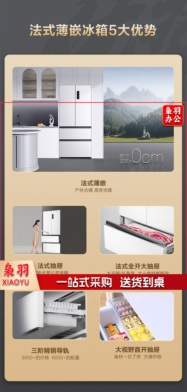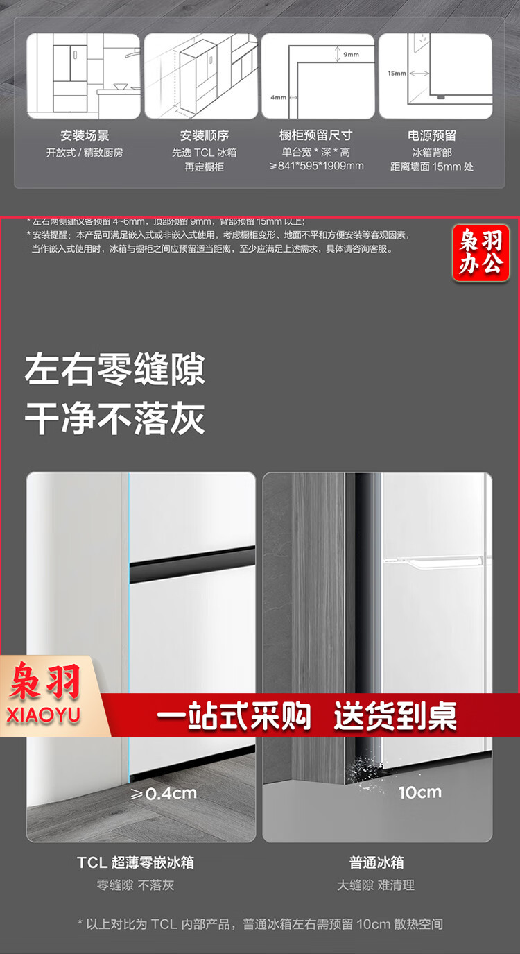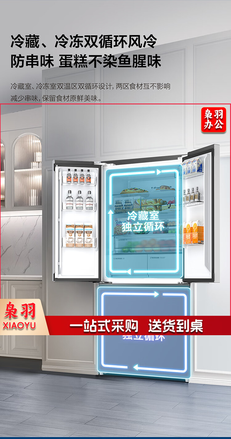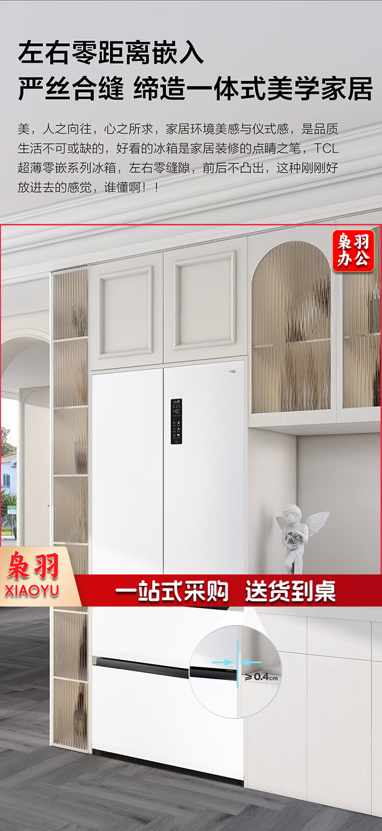 TCL 466升T9法式四开门58cm超薄零嵌入式白色风冷家用电冰箱杀菌除味一级能效大容量双循环R466T9-DQ