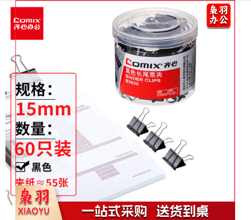 齐心/COMIX B3630 长尾票夹 15mm 60只/筒 黑色 单位:筒