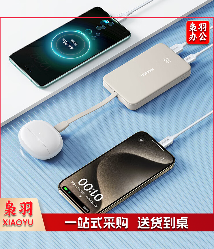 绿联 充电宝自带Type-C线20W快充 10000毫安时可上飞机小巧便携移动电源