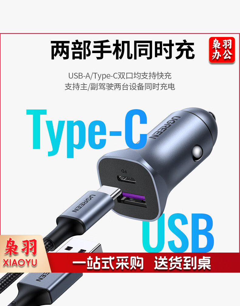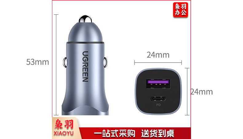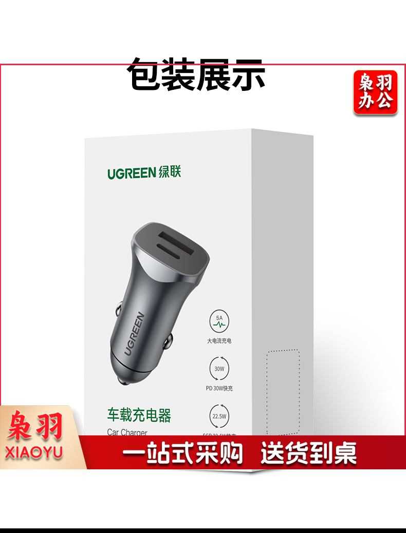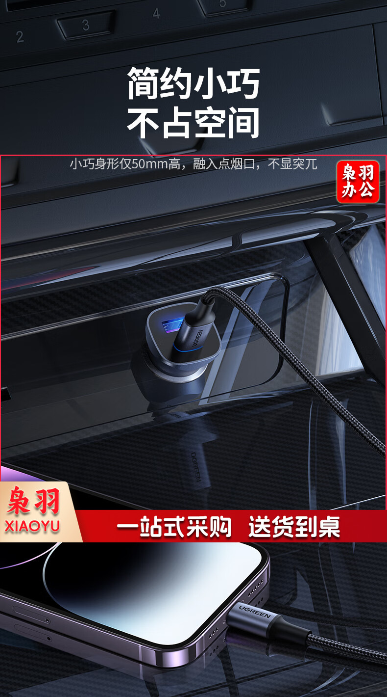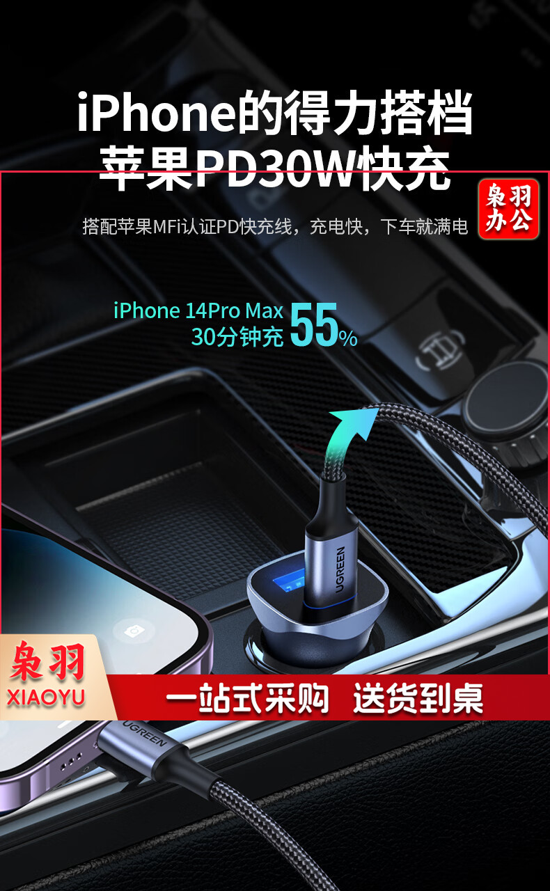 绿联 车载充电器 苹果PD30W快充头一拖二汽车点烟器充电器 40858